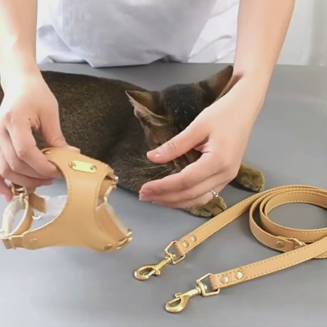 Dazzle and delight with the chic and stylish Rio Cat Harness & Leash Set. Crafted to repel fur, waterproof, and exquisitely adjustable for a tailored fit, this lightweight leather harness guarantees your cat looks and feels fabulous. Because when it comes to style, only the finest will do.