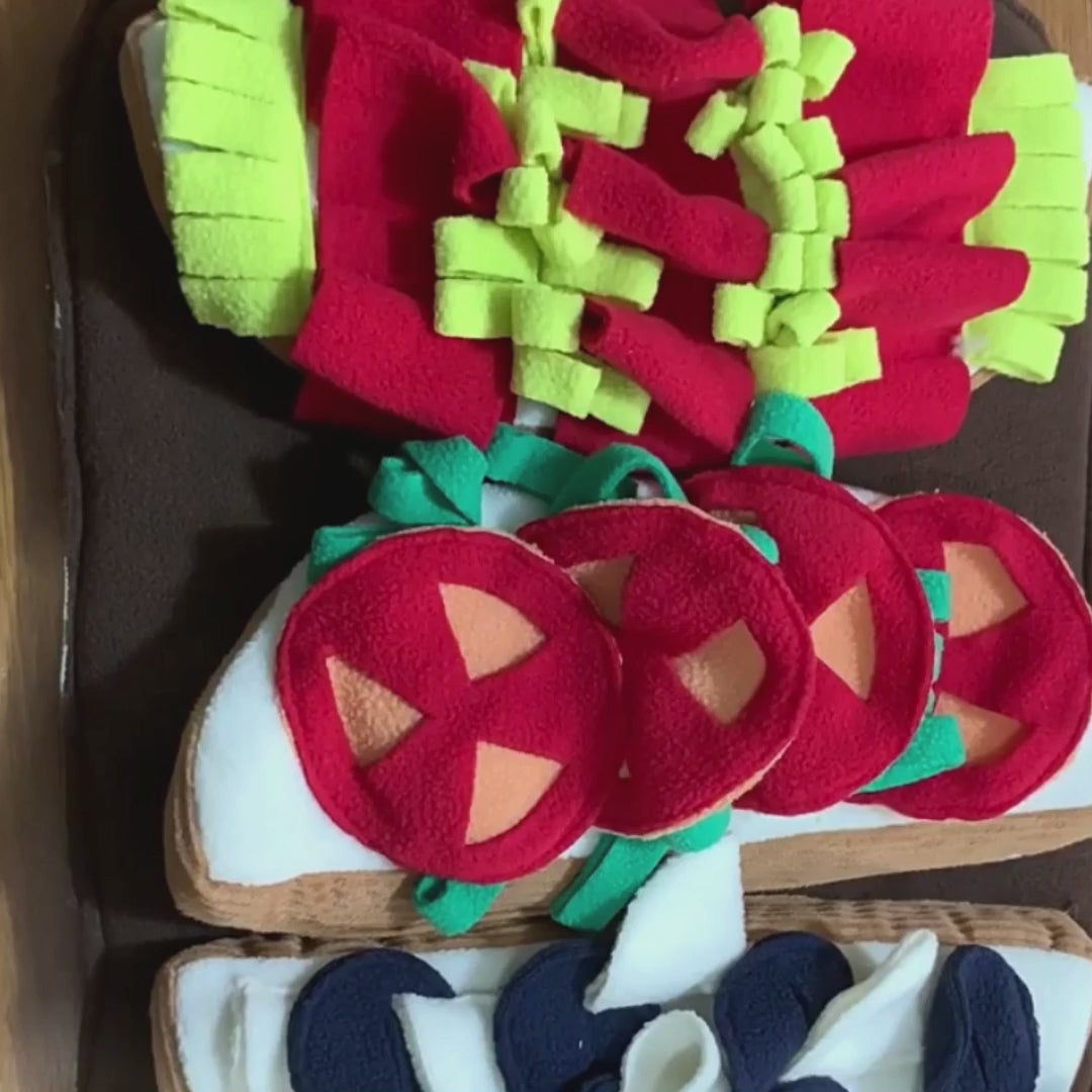 The soft fleece material is gentle on your fur baby's nose, while the anti-slip bottom ensures stability during play. With its varied textures and hidden pockets, this snuffle mat not only satisfies your catās natural foraging instincts but also adds a playful, culinary charm to their playtime!