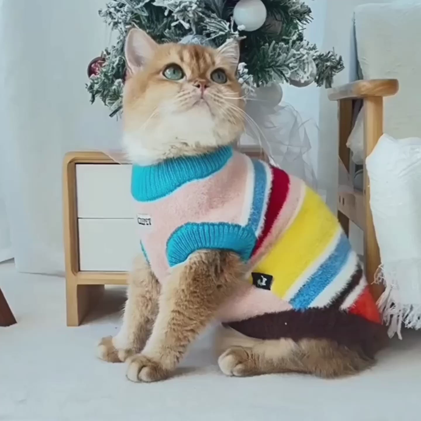 Soft rainbow stripes wrap your kitty like cozy sprinkles, blending warm neutrals with playful pops of color. This sweater is pure happy energy and impossible to ignore.